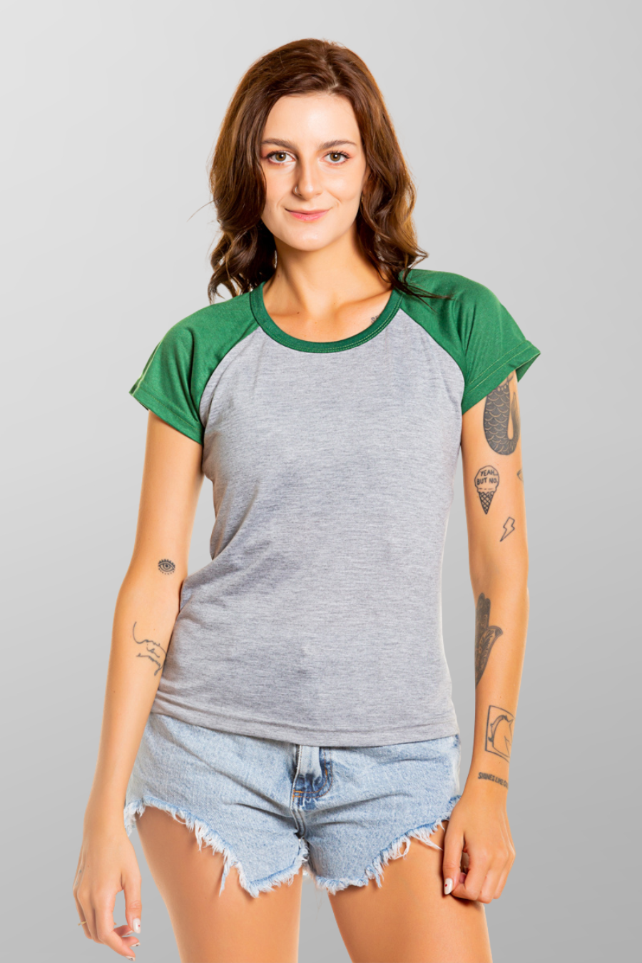 Baby Look Raglan Cinza Mescla com manga Verde 100% Poliester