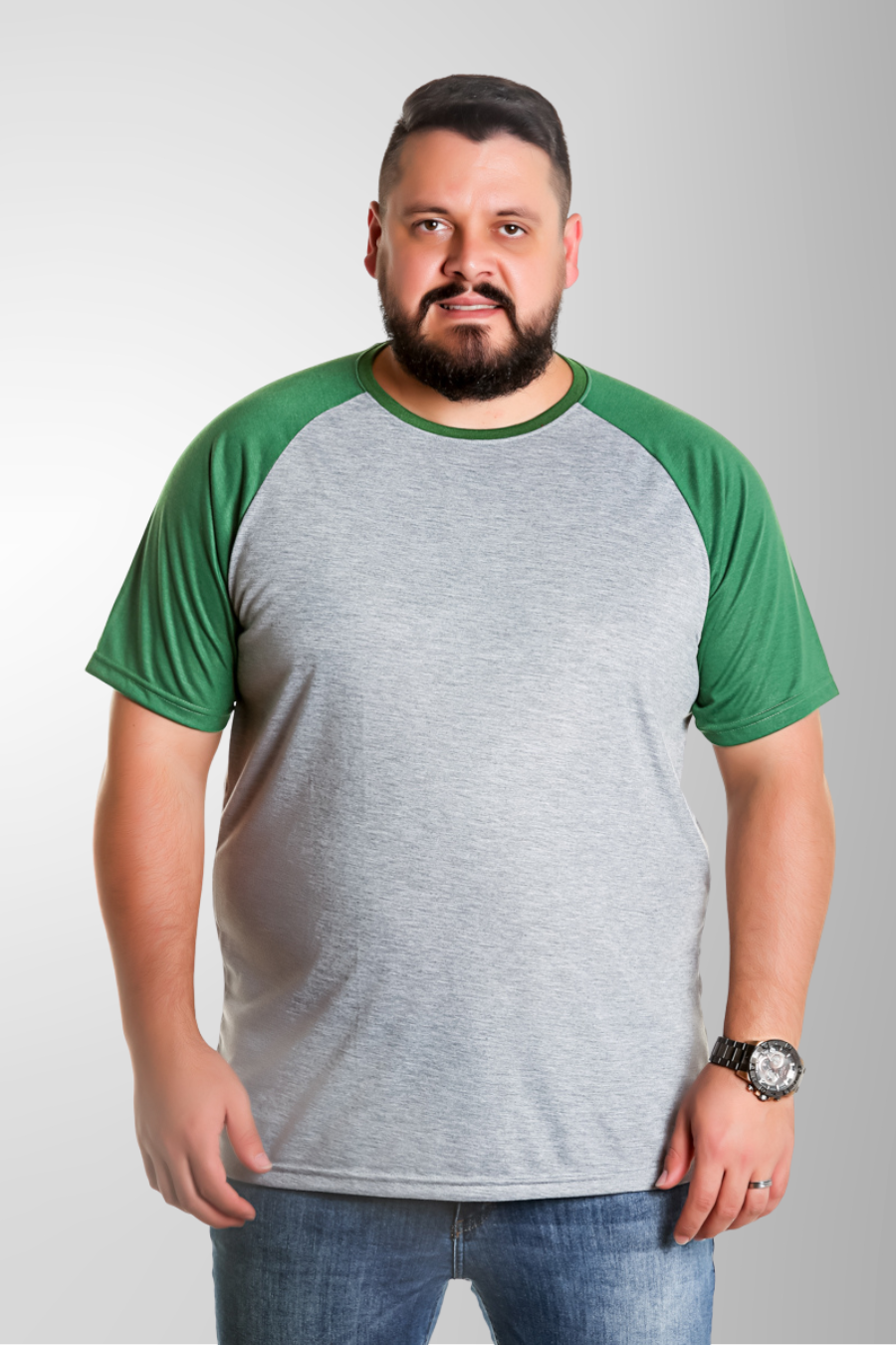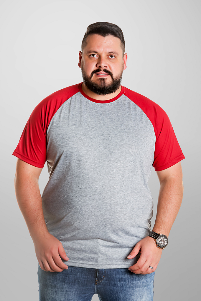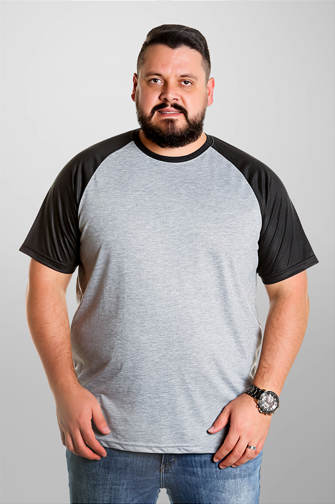 Camiseta Masculina Raglan Plus Size Cinza Mescla Com Manga Preta 100% Poliéster